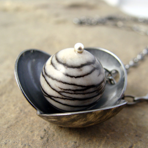 Wisior wykonany od podstaw ręcznie, ze srebra próby 925, oraz kuli jaspisu. Srebro oksydowane i polerowane.